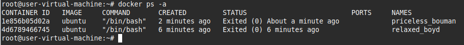 We can see we have two containers now with the newer one being named priceless_bouman. You can also see under COMMAND that the ubuntu image is by default issuing the /bin/bash command to keep the container alive so that we can use the interactive terminal.