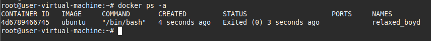 Nothing is running, why? When we say docker run ubuntu without -it, it will start and exit immediately because no interactive terminal is allocated. We can view the immediate exit by issuing this command which will show us all containers even the ones that are stopped.